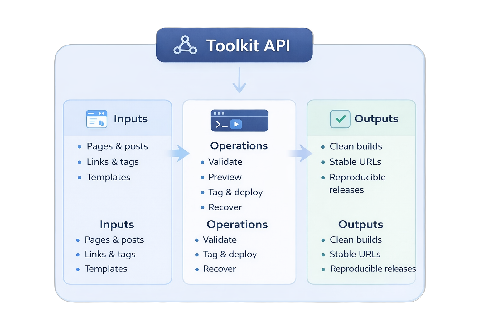 Think of the Automation Toolkit as a lightweight “API” for your repository: predictable inputs, safe operations, and reliable outputs.