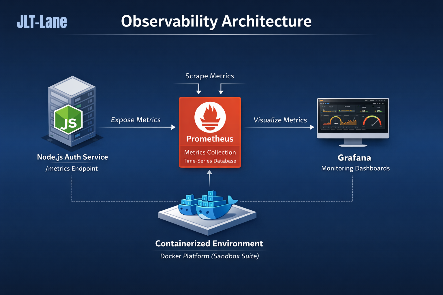 Observability is how the platform explains its own behavior. This page documents the path from service-level metrics to dashboards and operational visibility inside the JLT-Lane sandbox environment.